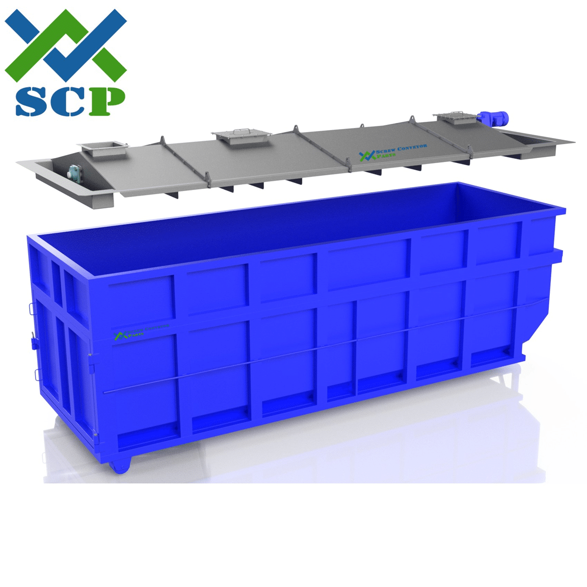 The SCP dumpster leveler is built from heavy duty carbon steel utilizing proven components ensuring a reliable and worry-free operation. The cover, built with an integrated leveling screw, is made of heavy duty 3/16” thk steel and designed to be walked on for maintenance and inspection. The leveling screw is made from 7/16” Thk helicoid flighting with heavy duty shafts and bearings. The screw conveyor drive is designed with a 1.4 service factor so it can outlast the life of the equipment. Each SCP Dumpster Leveler comes with inspection covers for the screw and a large site glass to monitor material level. Many options are available to customize the leveler to the exact needs of each plant. Designed and built in the USA, the SCP Dumpster Leveler can be delivered in only a few weeks and is sure to provide a lifetime or worry-free operation.
