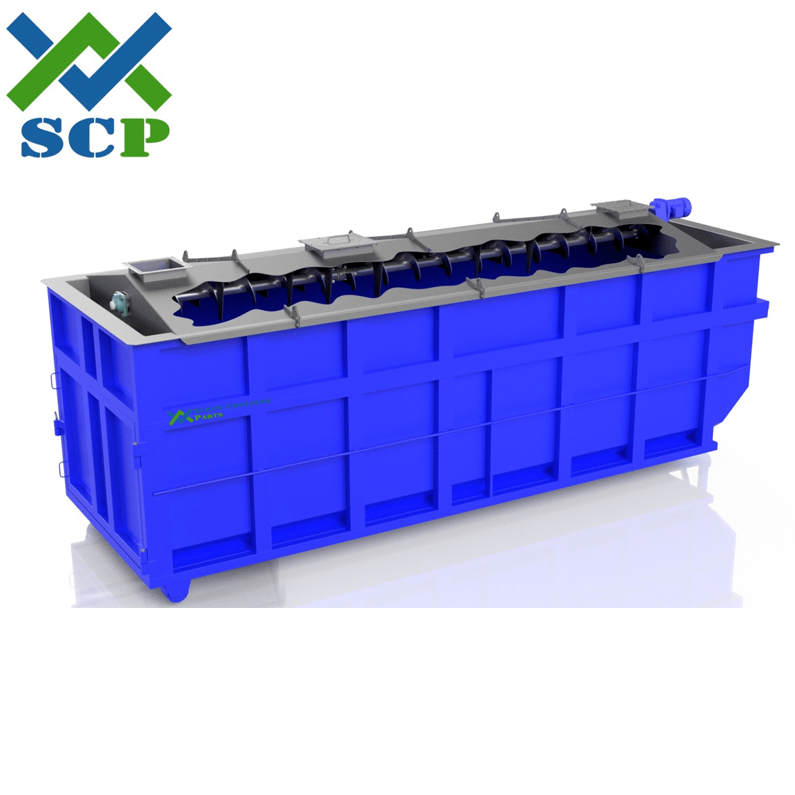 The SCP dumpster leveler is a unique solution to both contain dust and take advantage of the complete storage capacity of any dumpster (Roll-Off). Most waste streams sent to a dumpster are dropped at a single point with a standard screw conveyor or a few points with multiple discharge points. To utilize the complete capacity of the dumpster, often an operator must manually level the pile with either a rake or shovel. This exposes the operator to potential entrapment and respiratory hazards. The SCP dumpster leveler has an integrated leveling screw to automatically level and distribute the waste material, while containing dust and fumes. This innovative design saves labor, while increasing reliability and manufacturing uptime.
